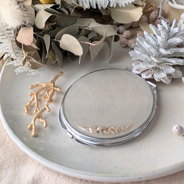 ※ご購入前に必ず【SHOPPING GUIDE】をご覧ください 淡くキラキラと輝く水彩アートがとても大人っぽい仕上がりの丸い形の手鏡です 中は上下に鏡がついています お出かけ先での身だしなみチェックなどにもちょうどいい大きさです 外径 : 横約7.2㎝×縦約7.5㎝×厚さ約1㎝ ※鏡ですので、高い場所からの落下などによる割れにご注意ください。