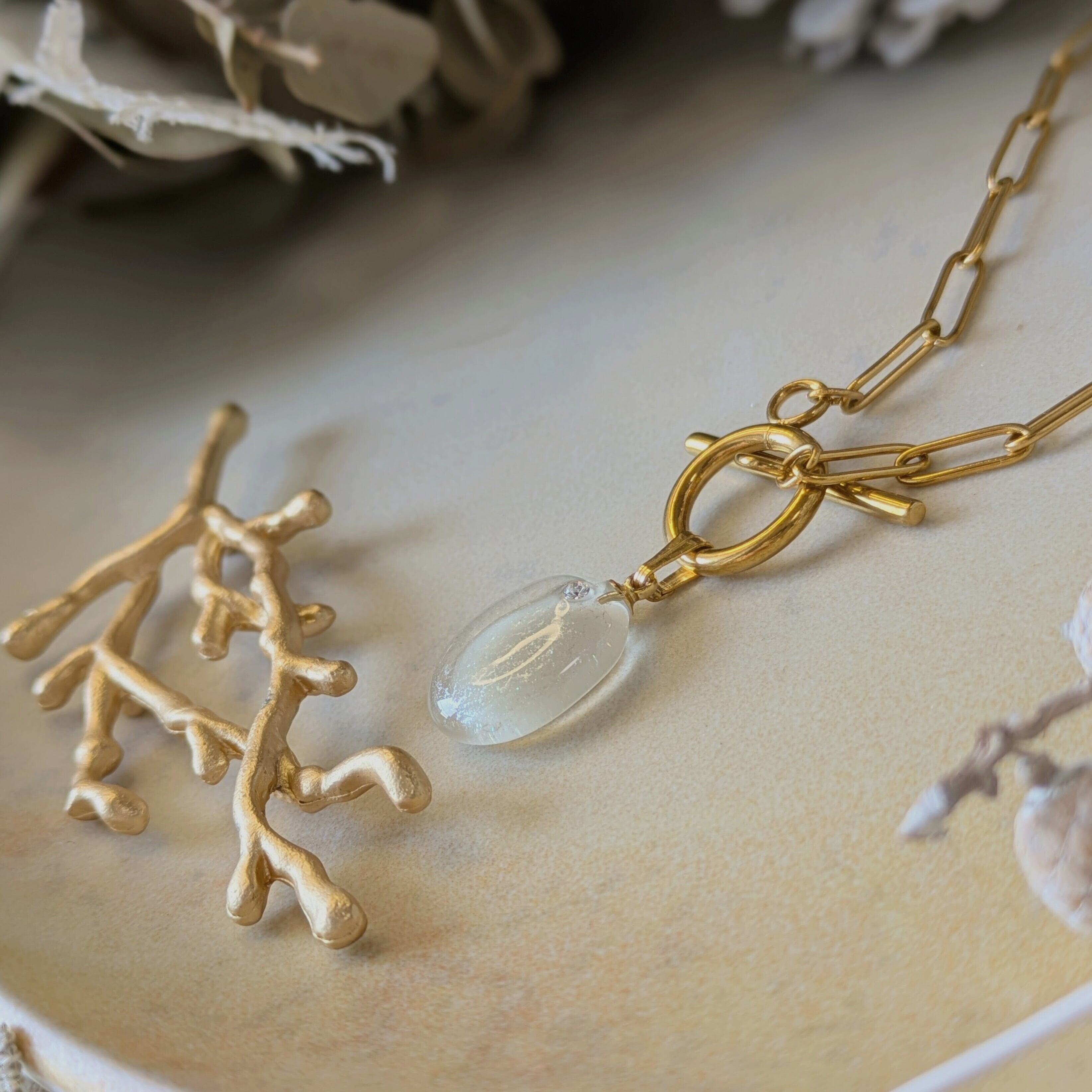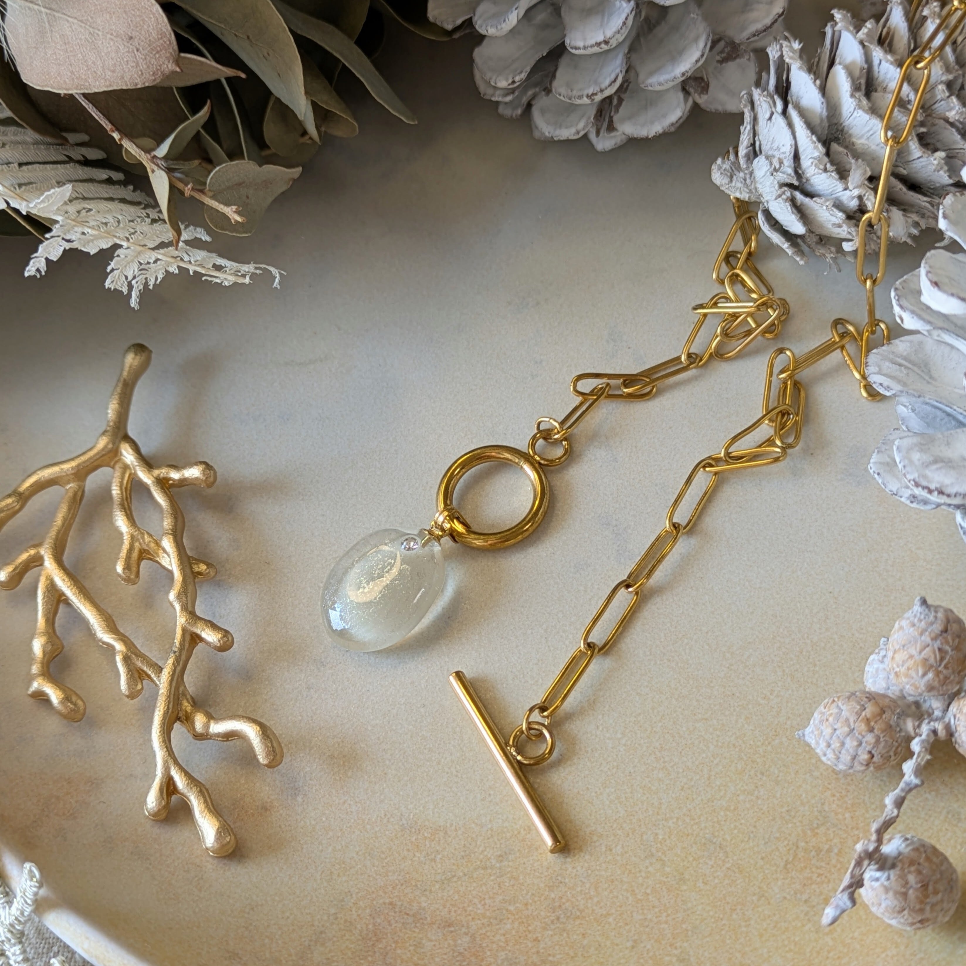 水彩アートを施したレジンチャームがキラリと光るマンテルタイプのネックレスです